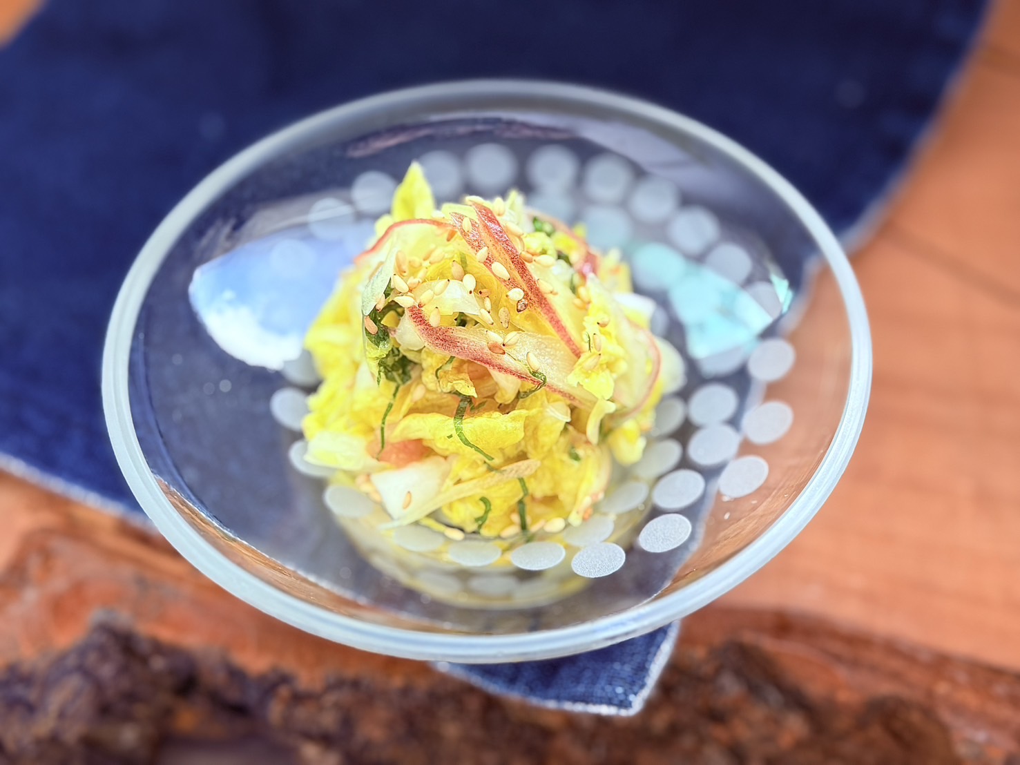 白菜の黄色にピンク色に発色したミョウガと梅肉がかわいい。